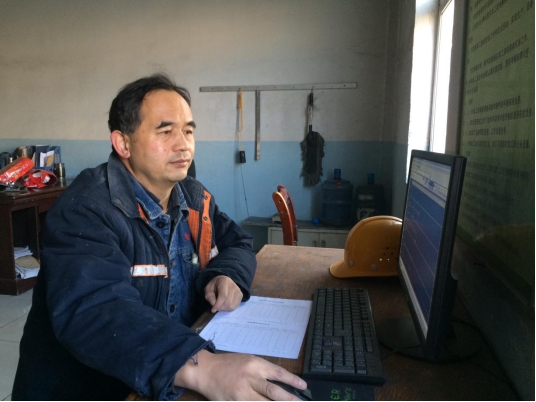 圖為:白成業(yè)(左一)在對(duì)作業(yè)長(zhǎng)進(jìn)行現(xiàn)場(chǎng)培訓(xùn)