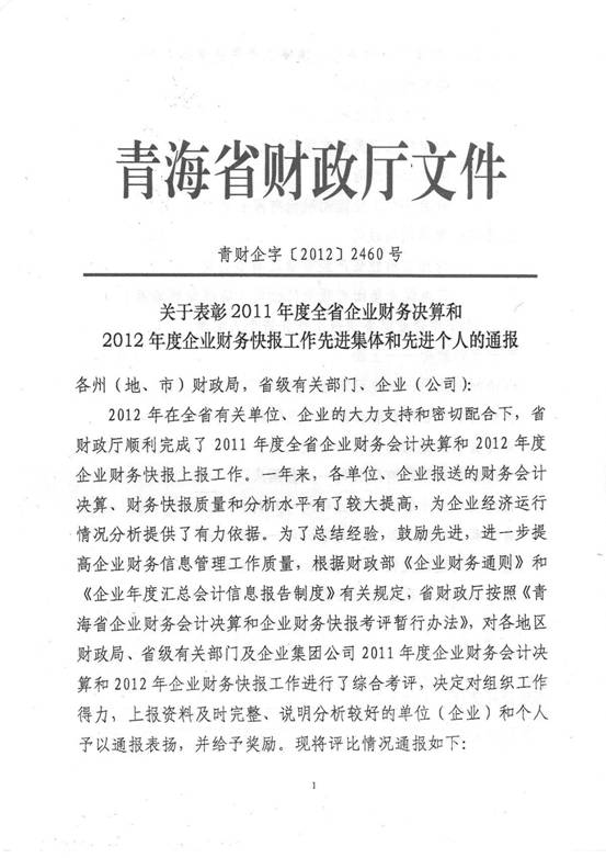 2012年,在集團(tuán)及所屬各公司領(lǐng)導(dǎo)的高度重視下,在所屬各公司的大力支持和密切配合下,在辛勤工作在財(cái)務(wù)會(huì)計(jì)崗位上的同事們的共同努力下,集團(tuán)總公司圓滿完成了省國(guó)資委和省財(cái)政廳各類(lèi)報(bào)表的上報(bào)工作,財(cái)務(wù)信息工作質(zhì)量、時(shí)效性和財(cái)務(wù)分析水平都比上一年度有所提高,受到了省國(guó)資委和省財(cái)政廳的好評(píng),集團(tuán)總公司2011年度財(cái)務(wù)決算工作被省國(guó)資委評(píng)為先進(jìn)單位,集團(tuán)財(cái)務(wù)審計(jì)部張莉青同志被省財(cái)政廳評(píng)為2012年度財(cái)務(wù)快報(bào)工作先進(jìn)個(gè)人。