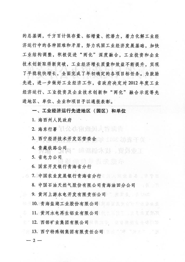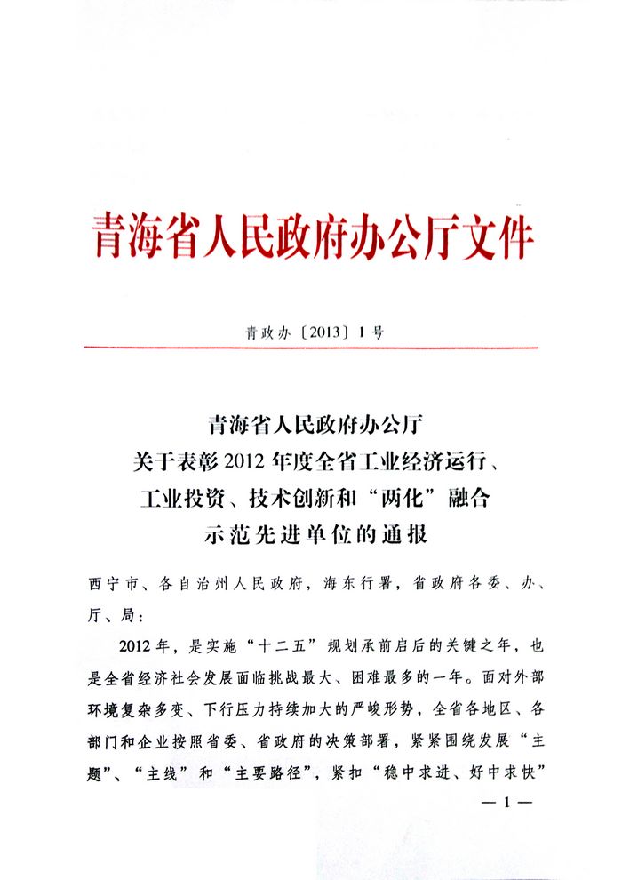 2012年,青海省物產(chǎn)集團(tuán)總公司在省委、省政府及省國資委的大力支持和領(lǐng)導(dǎo)下,集團(tuán)總公司按照全省工業(yè)經(jīng)濟(jì)總體部署和要求,著力推進(jìn)工業(yè)項目建設(shè),榮獲"2012年度工業(yè)投資貢獻(xiàn)獎"。